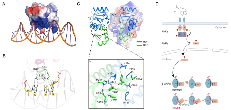 细胞分裂素(cytokinin)是一种重要的植物激素,在植物的生长发育中扮演着多种角色,包括维持分生组织、促进维管组织分化、调控叶片衰老和促进再生等。以往的研究表明,细胞分裂素的信号传递类似于细菌的双组分系统,通过磷酸中转系统将信号从细胞膜传递到细胞核内,进而激活特定的下游基因表达。此磷酸中转系统的最终目标是一类名为B型ARR转录因子(B-ARRs)的蛋白,它们包含保守的N末端接收结构域(Receiver Domain, RD)、中间的DNA结合结构域(DNA Binding Domain,DBD)和C末端的转录激活结构域(Transactivation Domain)。早在二十年前,研究人员就已经发现,当细胞分裂素被细胞表面受体识别后,信号会通过组氨酸磷酸转移蛋白(AHPs)上特定的组氨酸残基接受磷酸转移而介导,进一步磷酸基团会被传递到B-ARRs的RD中的天冬氨酸残基上,从而迅速激活对细胞分裂素的转录响应。然而,这个调控过程的详细分子机制仍不清楚。