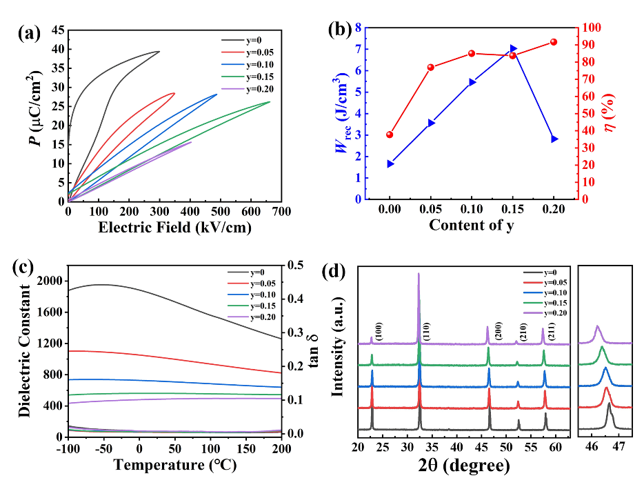 (a) NN-BNT-100yBMH陶瓷的电滞回线, (b) NN-BNT-100yBMH陶瓷的储能特性, (c) NN-BNT-100yBMH陶瓷在100kHz下的介电温谱,(d) NN-BNT-100yBMH陶瓷的XRD谱图.