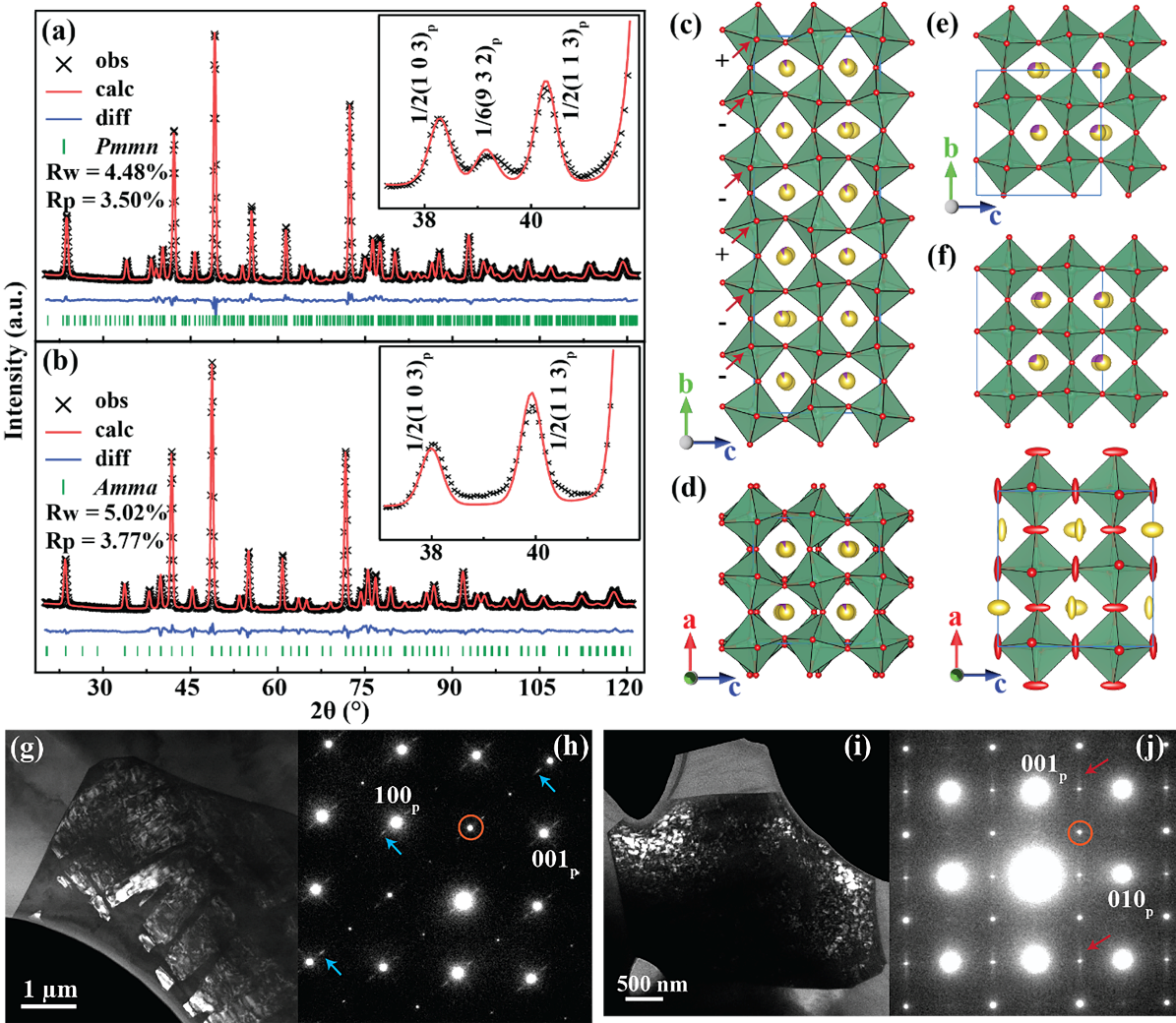 NN-BNT和NN-BNT-15BMH陶瓷的 (a-b)中子衍射精修结果 ,(c-f) 晶体结构,(g-f) TEM分析