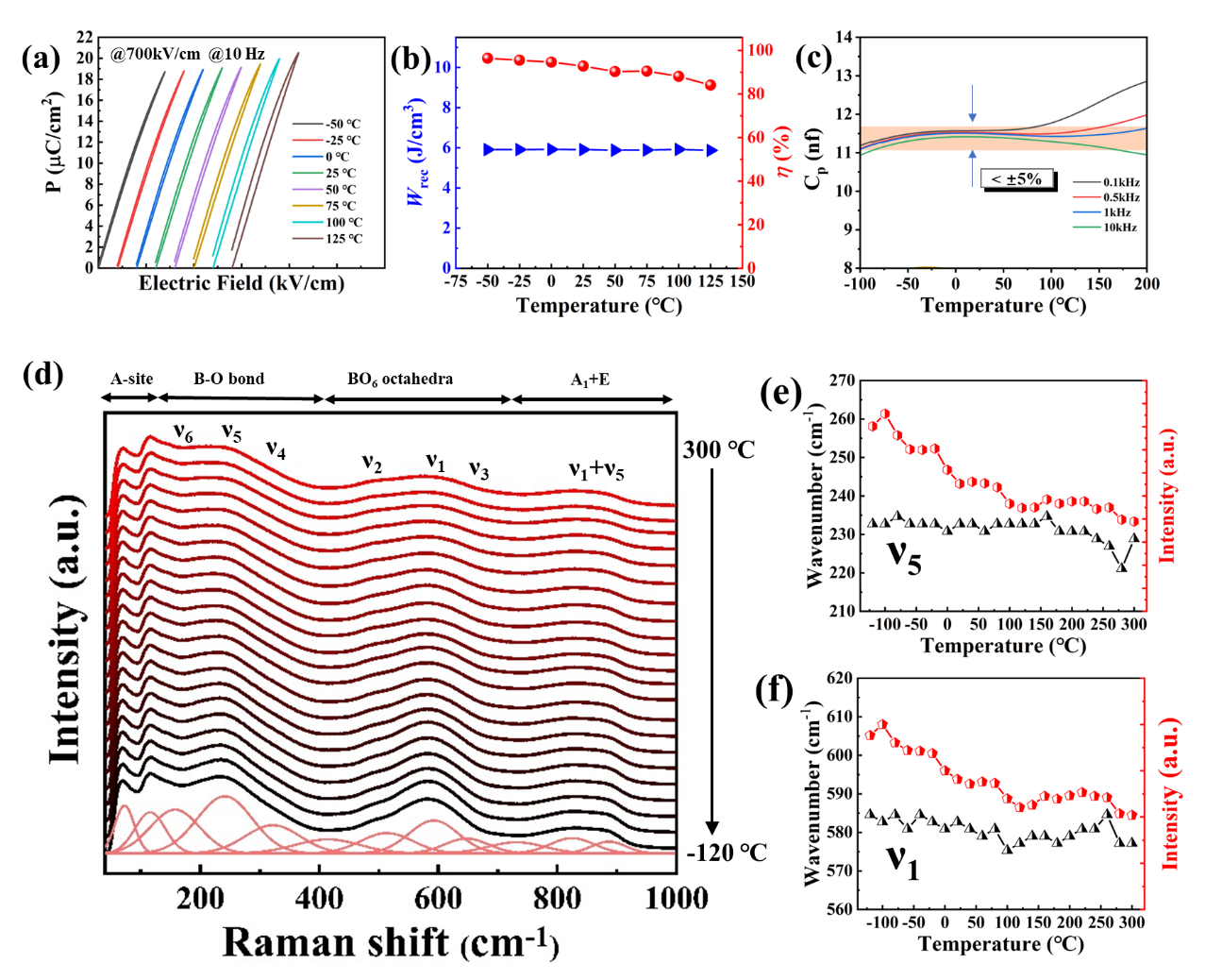 NN-BNT-15BMH MLCCs的(a-b) 变温电滞回线及储能特性, (c) 电容随温度的变化, (d-f) 变温拉曼光谱