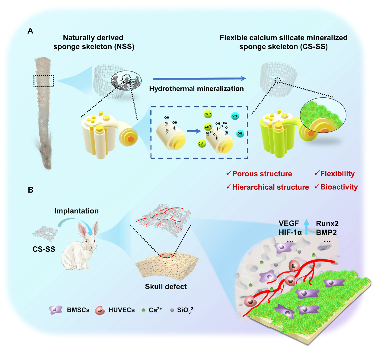 针对这一挑战,中国科学院上海硅酸盐研究所吴成铁研究员带领团队提出生物质再利用的策略,制备出天然海绵骨架衍生的柔性生物活性陶瓷,成功实现了将废弃的天然生物质转化为具有高附加值的生物医用材料。