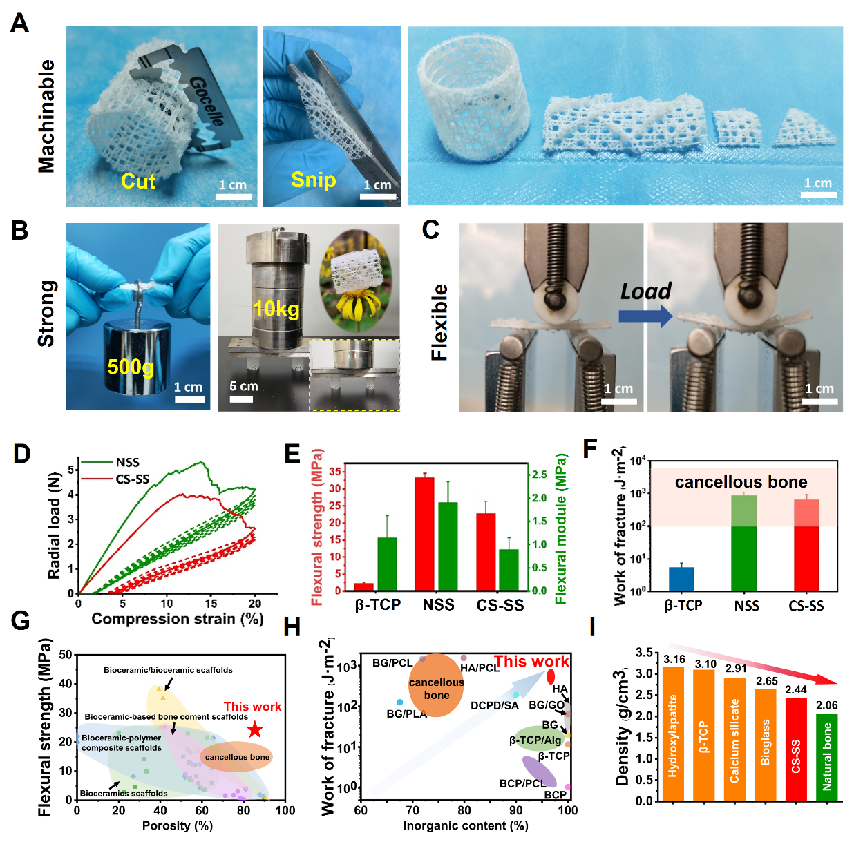天然衍生的生物陶瓷支架具有优异的可加工性、柔韧性及轻质高强的力学特性。(A)天然衍生的生物陶瓷可以任意剪切,加工为任意形状。(B,C)天然衍生的生物陶瓷支架具有优异的力学强度及柔性。(D)天然衍生的生物陶瓷支架的循环压缩性能。(E,F)抗弯强度及断裂功。(G)孔隙率-抗弯强度对比图。(H)无机含量-断裂功对比图。(I)不同生物陶瓷的密度。
