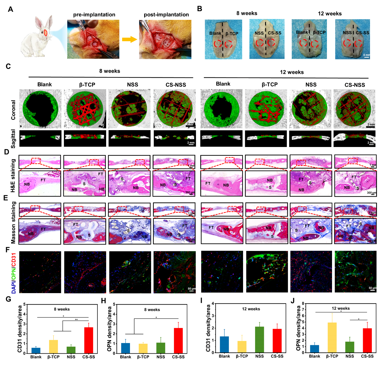 天然衍生的柔性生物陶瓷对兔子颅骨缺损实现高效血管化骨再生。(A)颅骨缺损模型构建。(B)颅骨组织的光学照片。(C)Micro-CT重构。(D,E)组织切片的HE及Masson染色。(F)OPN及CD31免疫荧光染色。(G-J)免疫荧光染色荧光强度定量统计。