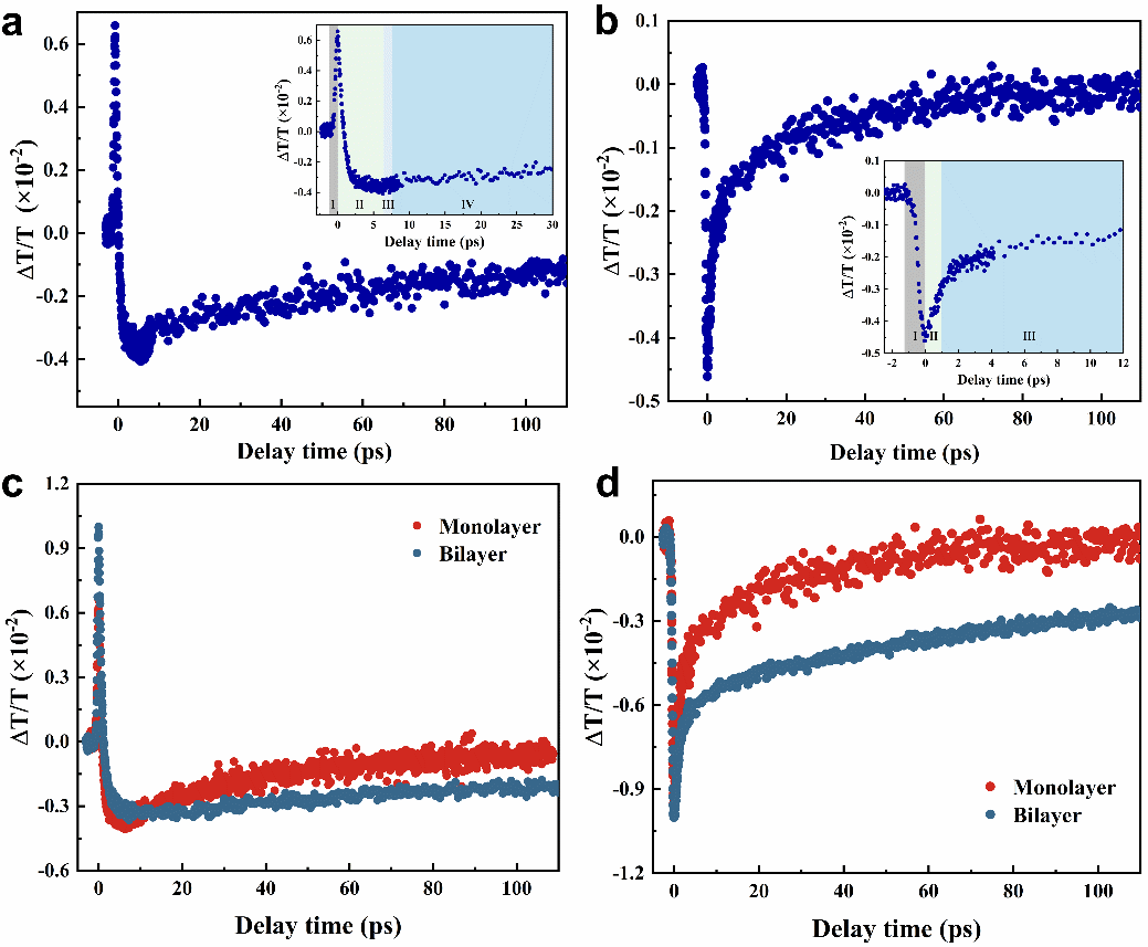图1. 在520 nm激发光作用下,单层ReSe2薄膜在 (a) 520 nm和 (b) 1040 nm探测波长下的超快载流子动力学过程;单层和双层ReSe2薄膜在 (c) 520 nm 和 (d) 1040 nm 探测波长下的超快载流子动力学过程对比。