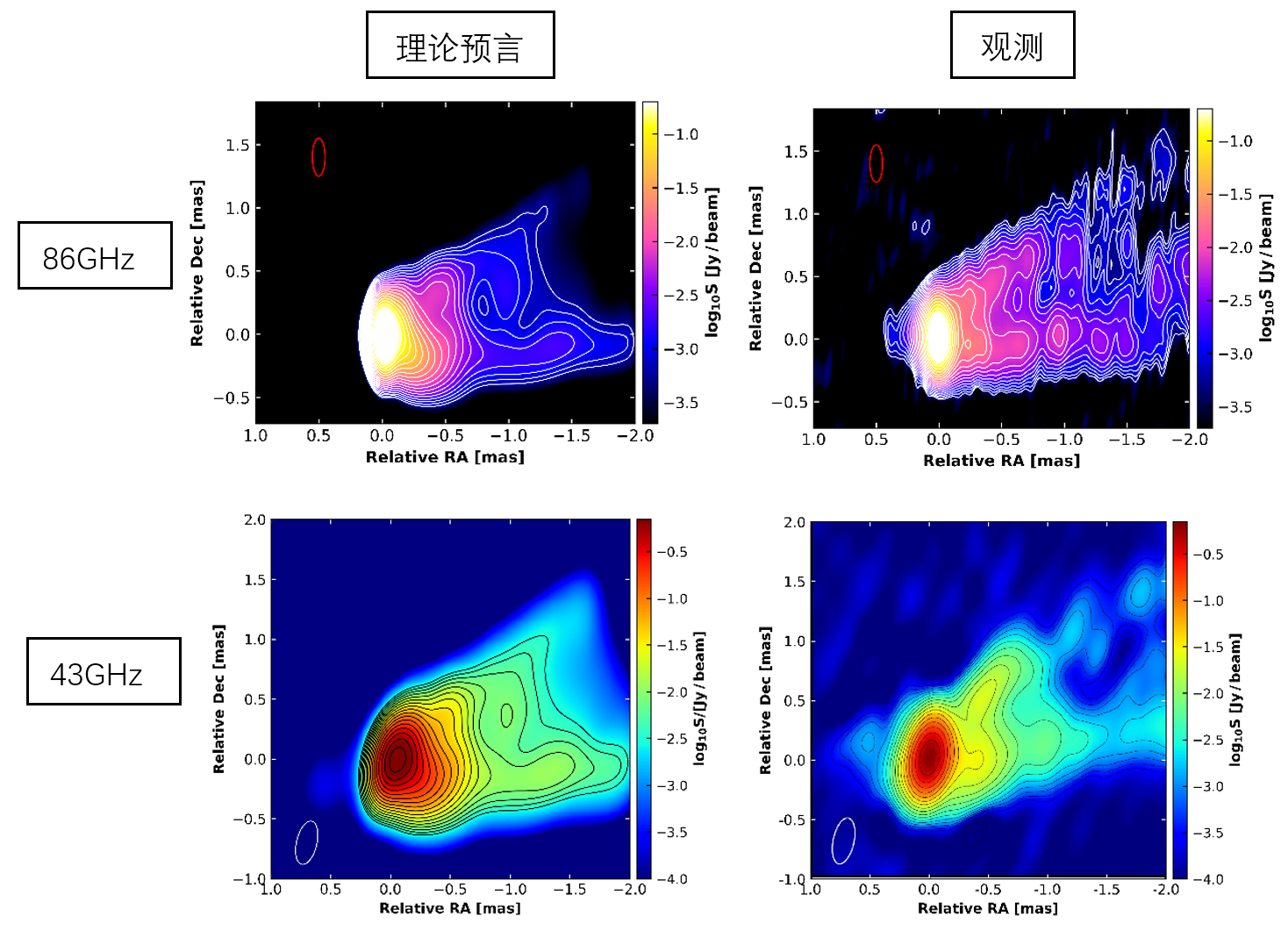 不管是哪个模型,天文学家们试图解决的都只是喷流的能量来源问题。但是,这两种模型产生的喷流能否与对喷流的形态、宽度、速度场、偏振等的观测结果一致?另外一个重要问题是,上述两个喷流形成机制的模型,哪一个是正确的?中国科学院上海天文台袁峰研究员领导的国际合作团队针对这两个问题进行了研究。他们发现,通过磁场提取黑洞转动能的模型所预言的喷流与观测结果非常一致,而另一个模型则难以解释观测结果。
