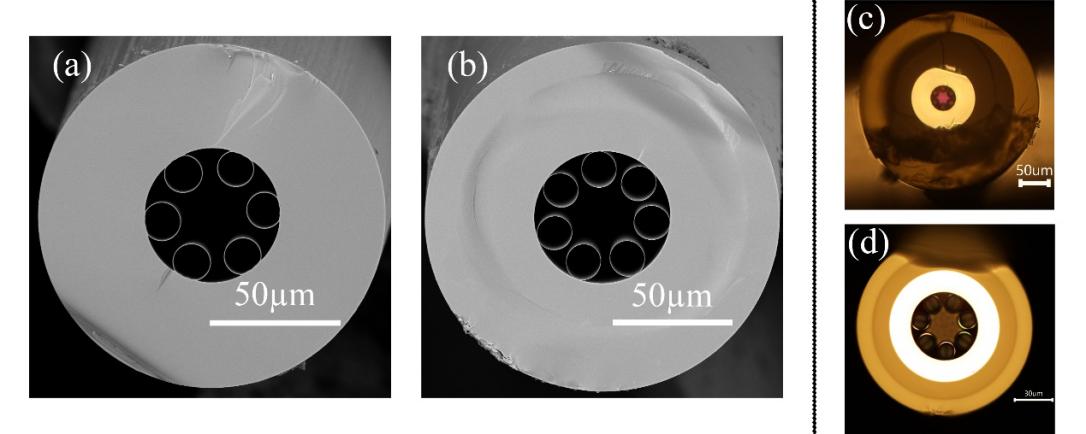 图1 两款反谐振空芯光纤的电子显微镜端面照片分别展示在(a)和(b)中,而(c)和(d)分别展示的是二者由光学显微镜背面打光拍摄的照片。