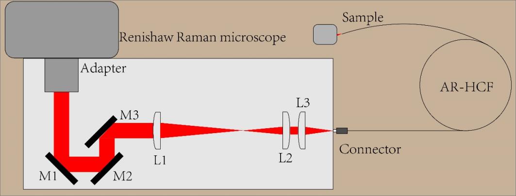近期,中国科学院上海光学精密机械研究所先进激光与光电功能材料部特种玻璃与光纤研究中心研究团队,针对原位检测拉曼信号的需求,利用自主设计制备的两款双包层反谐振空芯光纤(anti-resonant hollow-core fibers, AR-HCFs)与外接的光路模块对实验室商用Renishaw Invia共聚焦显微拉曼光谱仪进行了功能拓展,增加了原位检测功能。相关成果以“In-situ background-free Raman probe using double-cladding anti-resonant hollow-core fibers”为题发表在Biomedical Optics Express上。