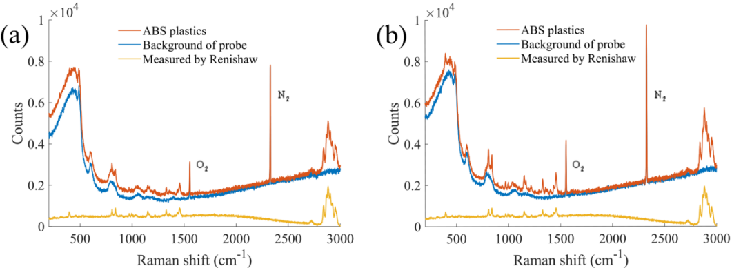 图3 图(a)(b)分别展示两种反谐振空芯光纤作为探针检测ABS塑料的拉曼光谱结果,其中橙色曲线由探针测量样品得到,蓝色曲线是探针自身的背景信号,黄色曲线是Renishaw Invia共聚焦显微拉曼光谱仪直接测量样品得到的光谱。