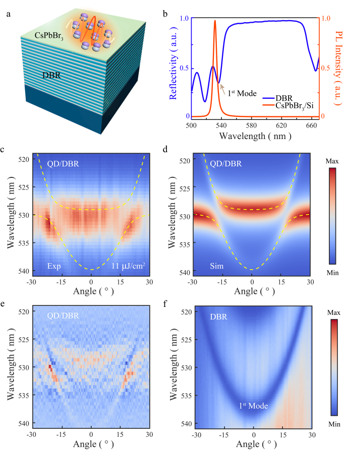图1(a)DBR衬底上的量子点薄膜结构示意图;(b)硅衬底上量子点薄膜的超荧光光谱和DBR衬底的反射谱;(c)DBR上的量子点超晶格薄膜的角分辨光致发光光谱;(d)计算极化激元的态密度随角度和波长的变;(e)图(c)的二阶导数图;(f)DBR的角分辨反射光谱。