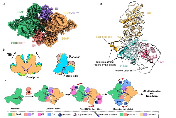 a,E6AP/E6复合物的整体结构(以Att1状态为代表,俯视图)。b,E6AP/E6复合物五种构象的比对示意图。两个E6AP/E6 protomer之间发生相互靠近或偏转的构象变化。c,E6AP/E6复合物的E6AP原子模型与单体E6AP的电子密度图比对。单体E6AP缺失α1-helix延长部分的电子密度,表明E6的结合诱导和/或稳定了α1-helix的延长。d,HPV E6劫持E6AP酶活性的模式图。