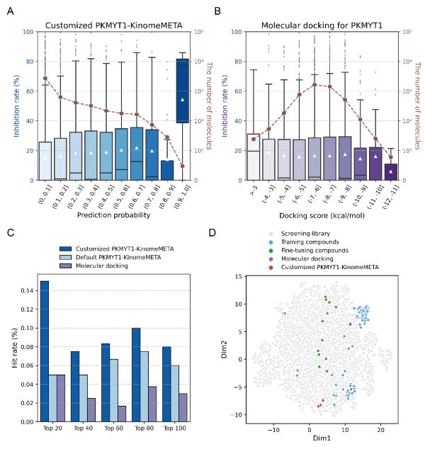此外,研究人员利用KinomeMETA前期对“暗”激酶PKMYT1小分子探针筛选的研究结果,基于KinomeMETA平台的“定制”功能增强模型,筛选了实验室内部的化合物,并进行了实验验证。结果表明,KinomeMETA平台通过少数活性化合物迅速增强了预测能力,对PKMYT1活性小分子探针的发现效率始终优于分子对接方法。