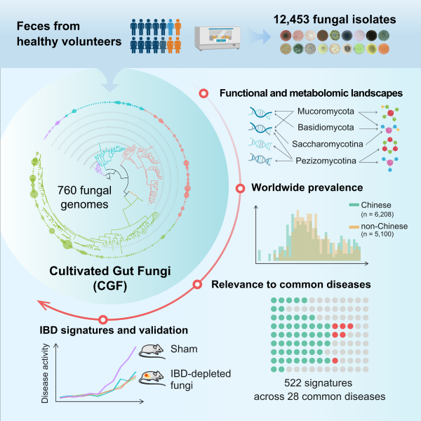 该研究利用培养组技术从135名健康中国人粪便样本中培养出12453株真菌,并进行全基因组测序,获得760个肠道真菌基因组,涵盖48科、206种,其中69种为首次鉴定。对206种真菌进行功能基因分析以及靶向代谢组学测定,阐述了肠道真菌在基因功能、代谢产物方面的特点。进一步分析1.1万个人类粪便宏基因组数据,揭示了中国和非中国人群的肠道真菌群落结构特征。更为重要的是,该研究分析了28个疾病的肠道真菌组特征,鉴定出疾病相关的肠道真菌特征信号,并聚焦炎性肠病患者的肠道真菌特征,在多种小鼠结肠炎模型中验证了目的菌株的生物功能、部分活性物质和分子机制。