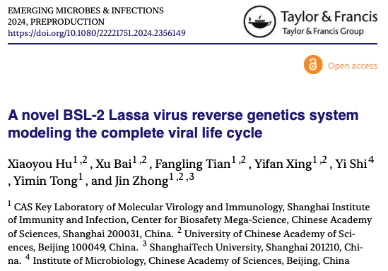 5月15日,国际学术期刊Emerging Microbes & Infections在线发表了中国科学院上海免疫与感染研究所钟劲研究组的研究论文:A novel BSL-2 Lassa virus reverse genetics systemmodeling the complete viral life cycle。