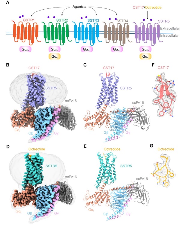 图1 (A) 激动剂介导的SSTRs的G蛋白信号传导通路示意图。(B-C) CST17-SSTR5-Gi复合物冷冻电镜结构。(D-E) Octreotide-SSTR5-Gi复合物冷冻电镜结构。(F) CST17在结构中的密度图。(F) Octreotide在结构中的密度图。