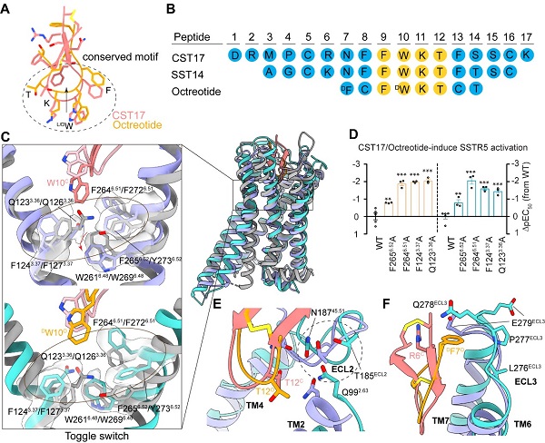 图2(A-B)内源肽和octreotide的结构和序列比对。(C) SSTR5中的"疏水锁"在结合激动剂后发生了构象重排。(D)功能数据验证关键氨基酸对CST17和octreotide激活SSTR5的影响。(E)两种复合物结构中ECL2构象的差异。(F)两种复合物结构中ECL3构象的差异。