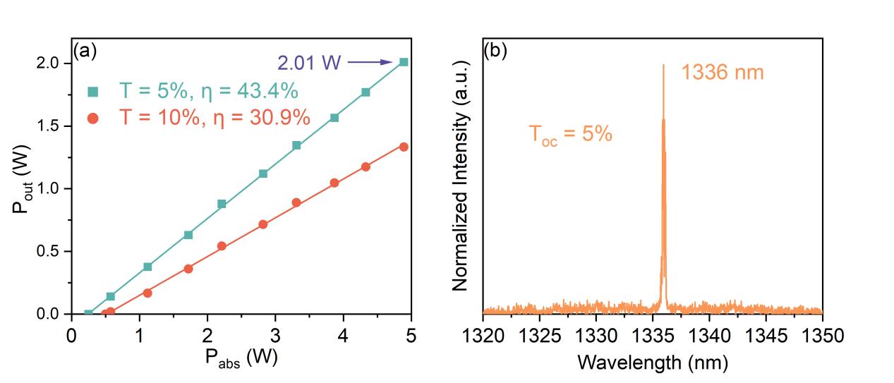 研究团队采用提拉法生长出0.93 at. %Nd:GSAG晶体,研究了其在1.3微米波段的激光性能。采用V型腔光路获得了斜率效率最高43.4%,最大功率2.01W的1336nm连续激光输出。利用Co:MgAl2O4晶体作为可饱和吸收体,获得平均功率0.2W,重复频率9.0KHz,脉宽34.4ns,峰值功率645W的被动调Q激光输出。实验结果表明,Nd:GSAG晶体能够提供高效1336nm的连续和脉冲激光输出,在光纤传输、医疗、航天、工业等领域具有应用前景。