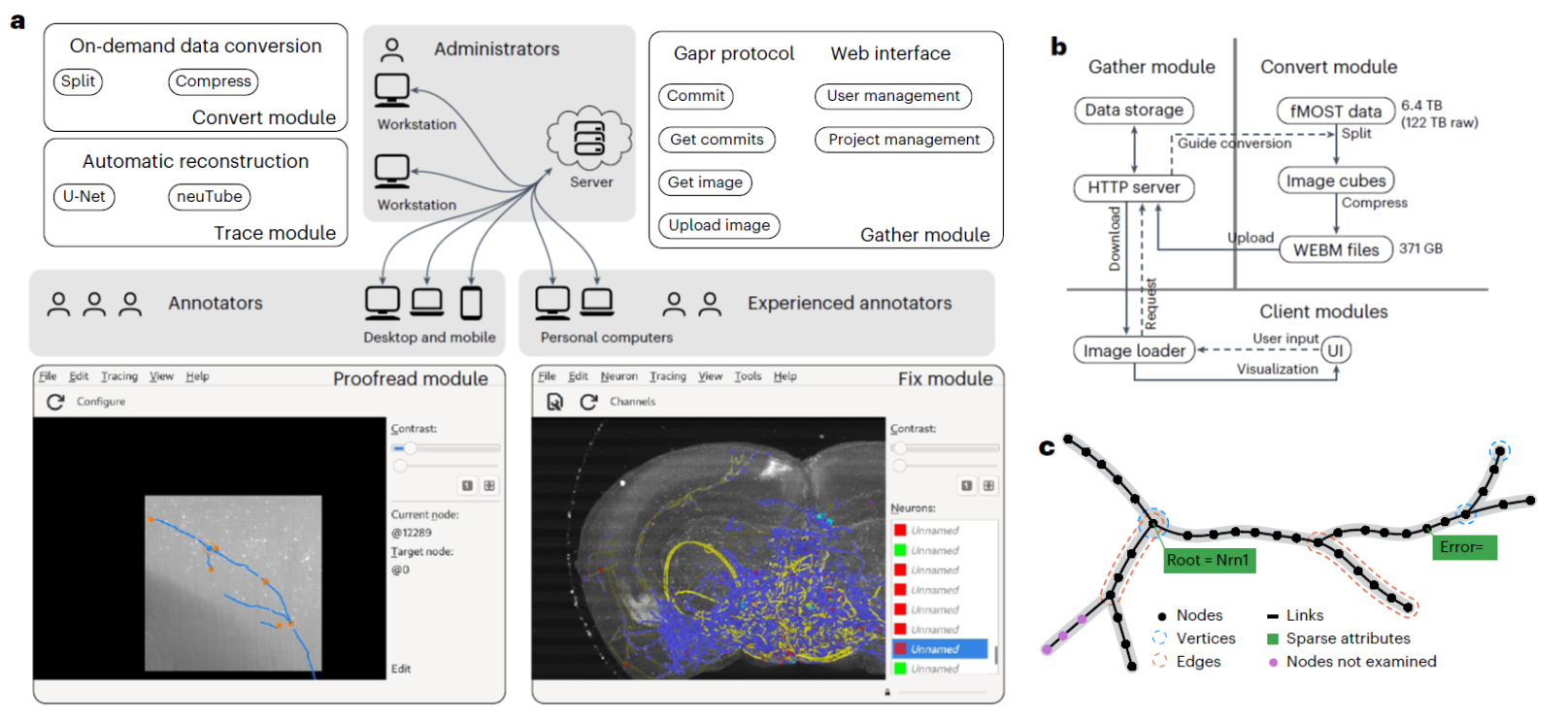 图1 Gapr神经元重构系统的架构。a,Gapr的五个模块,包含图像数据处理的Convert模块,自动重构的Trace模块,协同重构服务器端的Gather模块及人工校对的Proofread和Fix模块;b,响应用户需求的图像数据处理;c,Gapr的神经元模型,与SWC文件格式兼容。