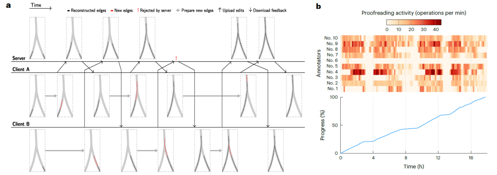 图2 Gapr中多用户协同重构的实现。a,在Gapr框架下避免重复追踪,确保结果一致性的示例;b,多人协同重构的实例,上图展示了参与重构的各个注释者的活动,下图为整体进度。