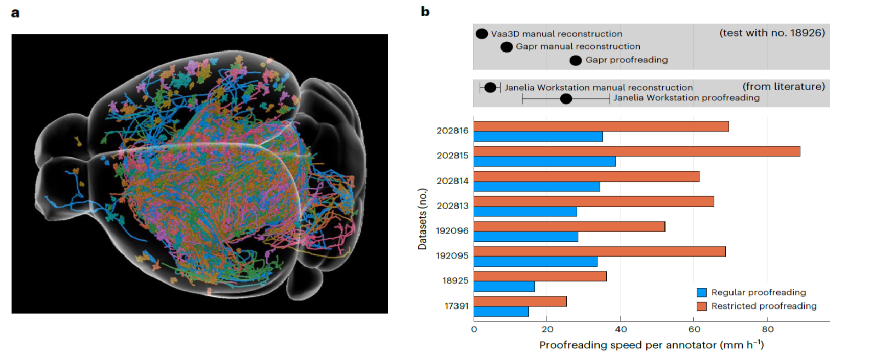 图3 Gapr软件在小鼠fMOST数据中的应用。a,在15组样本中重构获得的共计4278个神经元;b,Gapr中单个注释者的校对速度,上部分列出了与Janelia Workstation和Vaa3D的手动重构与校对速度的对比。