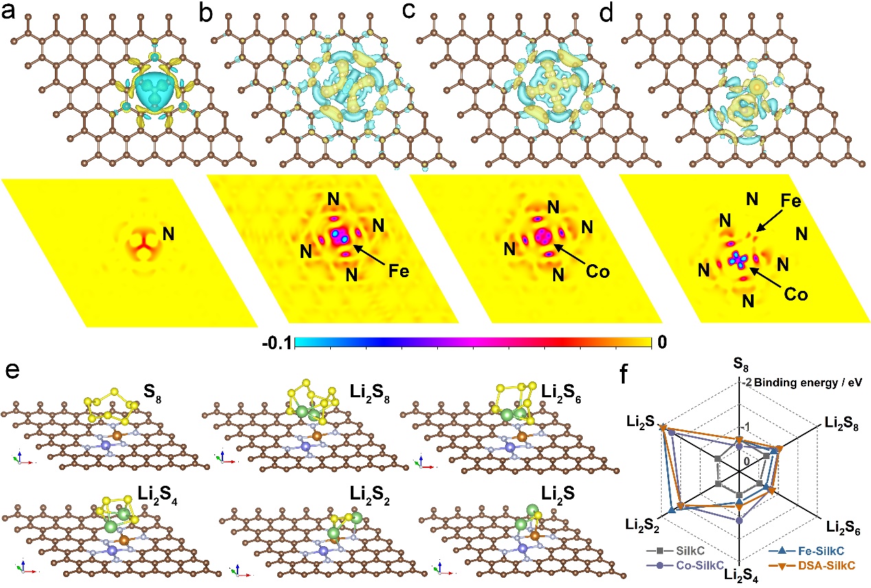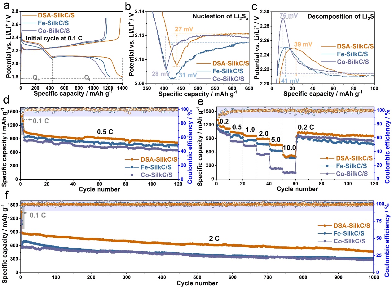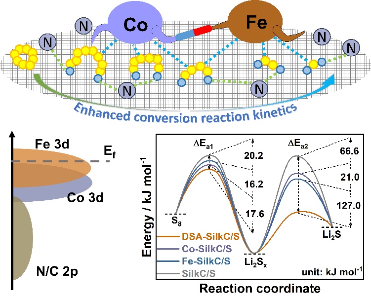 为通过耦合不同的金属原子来极化电荷分布提高催化效应,并维持催化活性的长期循环稳定性,该团队采用离子热法设计了一种废弃蚕丝织物衍生的片状多孔氮掺杂碳,并对其进行了Fe/Co双金属单原子修饰(即DSA-SilkC),将其用作锂硫电池的高硫负载宿主。在这种具有高比表面积和丰富微孔的结构中,得益于蚕丝织物前驱体中的丰富的氨基和β-片状结构,Fe和Co单原子得以生成并均匀分散,且不会发生团聚。根据密度泛函理论(DFT)计算结果和电化学分析,在初始放电过程中,Co单原子促进了长链LiPS还原为Li2S4,而作为整个转化反应速率决定步骤的液固转化反应(Li2S4→Li2S)则由Fe单原子加速。得益于Fe和Co单金属位点在S8逐步锂化为Li2S过程中的“中继式”相互作用行为,采用DSA-SilkC的锂硫电池展现了高初始比容量(1399.0 mAh g-1)、出色的倍率性能(10 C)和优异的长循环寿命(在2 C条件下可循环1000次,每次容量衰减率仅为0.048%)。此外,基于DSA-SilkC宿主的锂硫电池还在高硫负载(8.5 mg cm-2)和贫电解质条件下展现出优异的高面容量(8.6 mAh cm-2)和循环稳定性。相关成果以“Relay-Type Catalysis by a Dual-Metal Single-Atom System in a Waste Biomass Derivative Host for High-Rate and Durable Li-S Batteries”为题发表于ACS Nano 2024, 18, 13468-13483。
