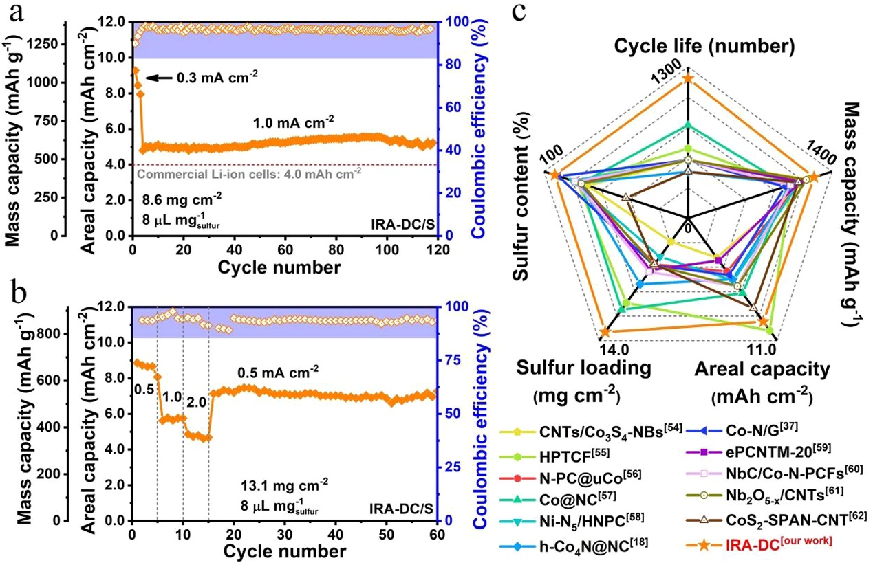 IRA-DC宿主材料组装的锂硫电池在高硫负载、贫电解液下的电化学性能