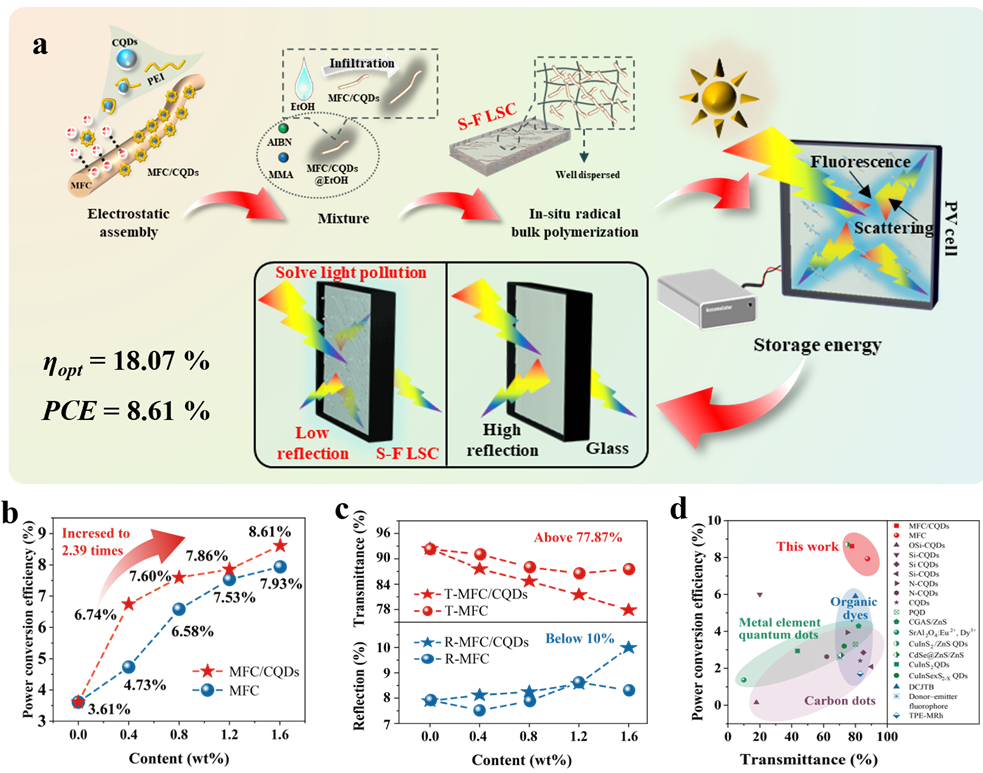 中国科学院宁波材料技术与工程研究所生物基高分子材料团队在朱锦研究员和那海宁研究员的带领下长期从事生物质转化利用技术与应用研究,围绕非粮生物质基高性能及功能材料开展了多项卓有成效的研究工作。近日,该团队基于非粮生物质纤维素所特有的散光本质及碳量子点拥有的荧光发光能力,开发出可同步实现对自然光散光及荧光发光的微纤化纤维素/碳量子点(MFC/CQDs)复合体,并通过原位自由基聚合的方法将其均质嵌入到有机玻璃中,由此形成了一类新型的散光-发光型太阳能聚光器(S-F LSC)。利用S-F LSC可同步实现太阳光的广谱光电转化利用和光污染抑制。S-F LSC的可见光透过率为77.87%,反光率仅为9.99%。同时,所制备的S-F LSC展现出明显优于传统LSC的光电转化效率(达到8.61%)。S-F LSC所具有的广谱太阳能利用和光污染抑制的协同作用,使其有望成为未来绿色社区建设中的关键透明节能构件。