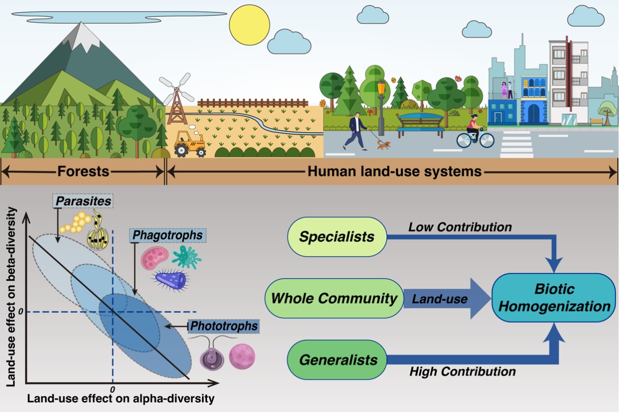 研究成果以Colonization ability and uniformity of resources and environmental factors determine biological homogenization of soil protists in human land-use systems为题,发表于环境生态学期刊Global Change Biology上。中国科学院城市环境研究所李志鹏博士后和上官华媛博士研究生为共同第一作者,孙新研究员为通讯作者。同时,德国哥廷根大学Stefan Scheu教授、北京大学朱彪研究员、罗蒙诺索夫莫斯科国立大学Yuri Mazei教授以及中国科学院城市环境研究所杨小茹研究员共同参与和指导了本项工作。本研究受到了国家自然科学基金国际(地区)合作与交流项目NSFC-UNEP、创新群体项目和中国科学院未来伙伴计划项目等资助。
