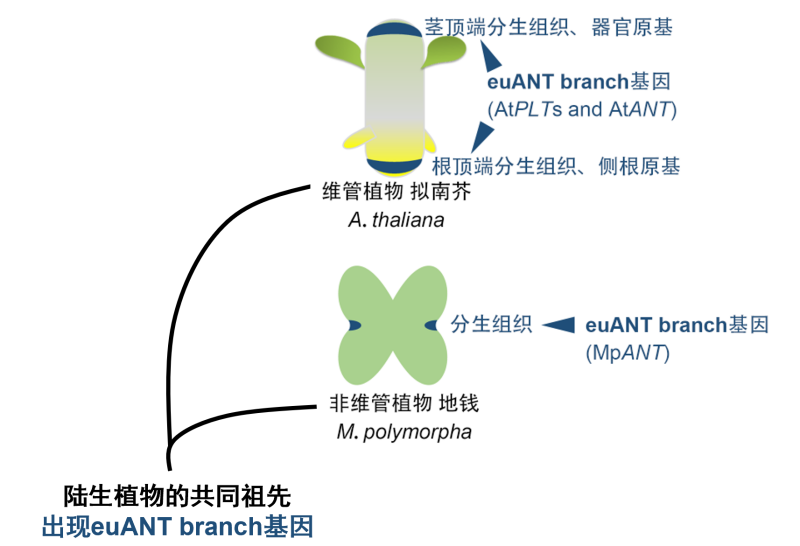 euANT branch基因起源于陆生植物的共同祖先。在拟南芥中,euANT branch包括多个AtPLT和AtANT基因,是茎顶端分生组织、根顶端分生组织、器官原基、形成层等发育的核心调控基因(Trends Plant Sci. 2014, 19:146-157)。在石松类维管植物小翠云和江南卷柏中,euANT branch基因也是根顶端分生组织发育的核心调控基因(Curr. Biol. 2023, 33:4085-097;Curr. Biol. 2023, 33:4069-4084)。这些研究暗示着,euANT branch基因可能在陆生植物的共同祖先中被用于原始分生组织的发育,这种原始功能被继承和保留在苔藓植物中(例如地钱)。在维管植物出现后,euANT branch基因扩张和发展,被招募到各种类型的分生组织中,继续调控着分生组织的发育。因此,euANT branch基因是调控陆生植物分生组织发育的关键保守基因。