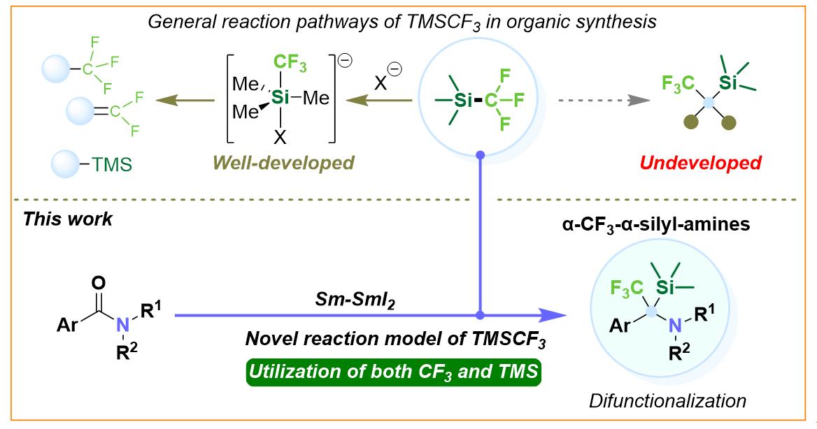 中国科学院上海有机化学研究所金属有机化学国家重点实验室王晓明课题组长期致力于双多核金属催化研究。近期,他们以TMSCF3作为官能团化试剂,利用Sm/SmI2单电子转移活化惰性酰胺,成功实现了酰胺直接脱氧双官能团化反应(J. Am. Chem. Soc. 2024, 10.1021/jacs.4c04760)。在该反应中,TMSCF3展现出了全新的反应模式:同时作为三氟甲基化试剂与硅基化试剂,两个基团被引入到了产物的同一个碳原子中,一步反应即可得到含有高度官能团化季碳中心的α-CF3-α-TMS的胺类化合物。通过初步的机理研究、一系列动力学研究和与蓝宇教授团队合作展开的理论计算研究相结合,初步证明了在该反应体系中酰胺首先发生了两次单电子还原生成了双负离子中间体,随后依次发生硅基化、钐(III)氧基团的离去和三氟甲基负离子的亲核进攻得到最终的目标产物。