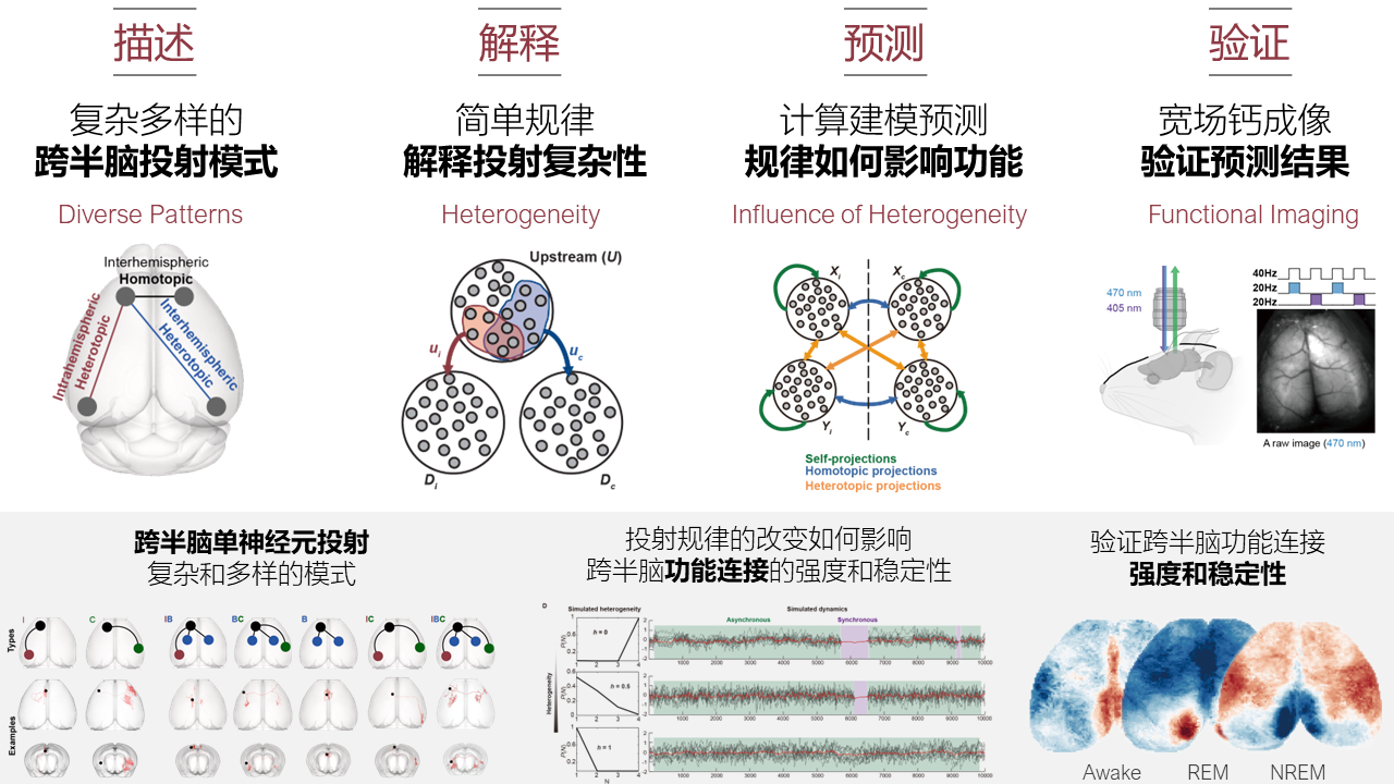 之前已有广泛的研究揭示半球间同源(Homotopic)脑区之间的连接的解剖特征和功能。然而对于大量的异源(Heterotopic)脑区间连接的结构和功能还知之甚少。然而,由于传统连接数据分辨率不足,难以描述皮层区域、分层和细胞特异性的连接模式,这限制了对异源投射的结构和功能的了解。