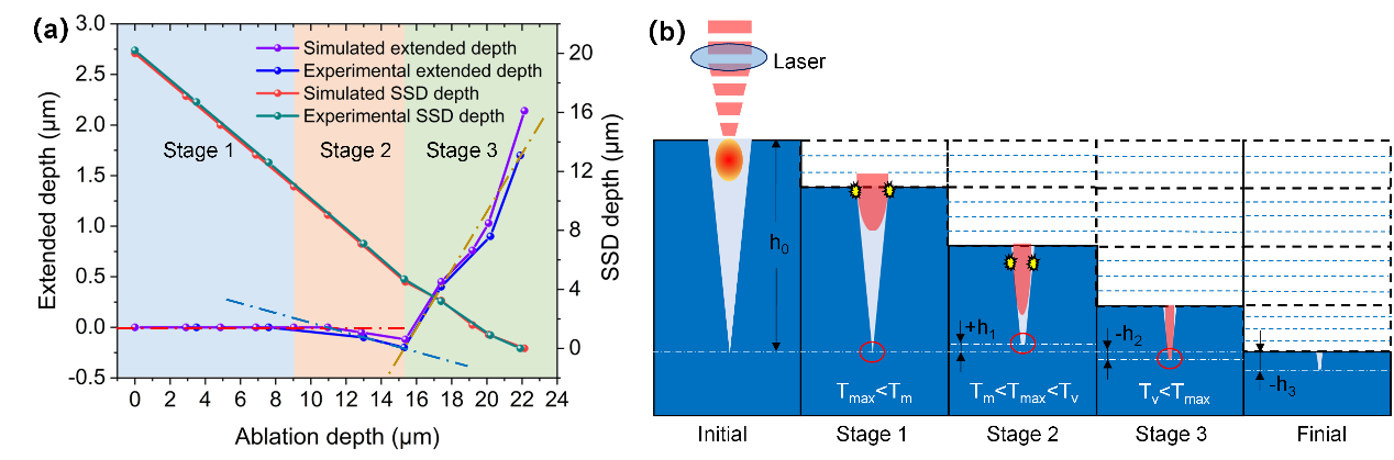 在本项工作中,研究人员建立了考虑光场调制的激光层析烧蚀多物理场模型,并采用飞秒激光预制了不同形貌的亚表面缺陷,准确预测亚表面缺陷深度数值,揭示亚表面缺陷在激光逐层烧蚀下的演化规律,并提出亚表面缺陷深度演变的三个阶段。这表明采用本方法不会导致亚表面缺陷的延伸,从而验证了利用激光层析烧蚀去除并表征亚表面缺陷的可行性与准确性。