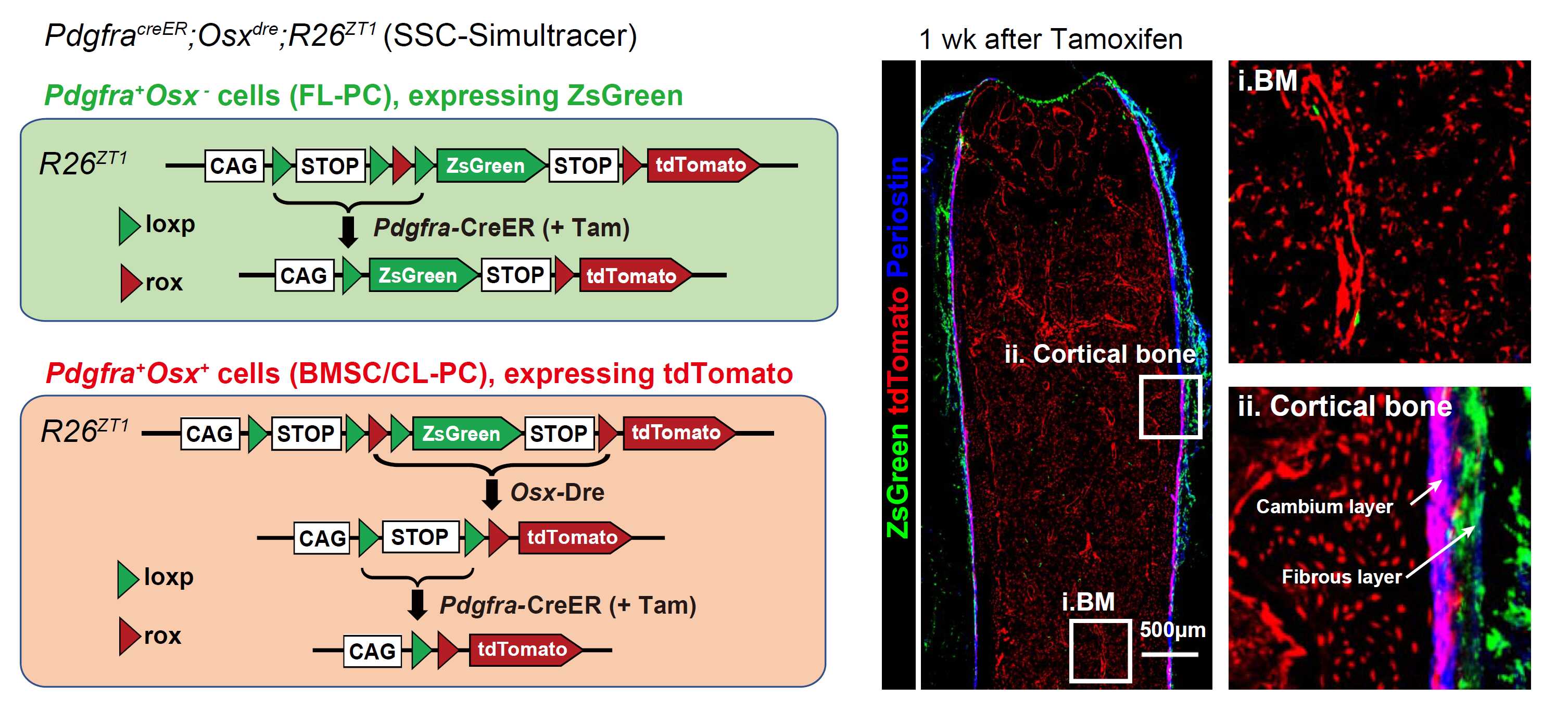 周波和邹卫国研究组一直致力于骨骼干细胞的谱系研究。在最近的这项工作中,他们构建了一个全新的双同源重组酶报告基因R26ZT1,并筛选了多种能标记骨骼干细胞的谱系示踪小鼠,从而建立一套可同步示踪两类异质的骨骼干细胞同步示踪系统(SSC-Simultracer)。此系统可以利用tdTomato和ZsGreen荧光蛋白的表达区分骨髓(BMSC)、骨外膜生发层(CL-PC)与骨外膜纤维层(FL-PC)中的骨骼干细胞的谱系命运。
