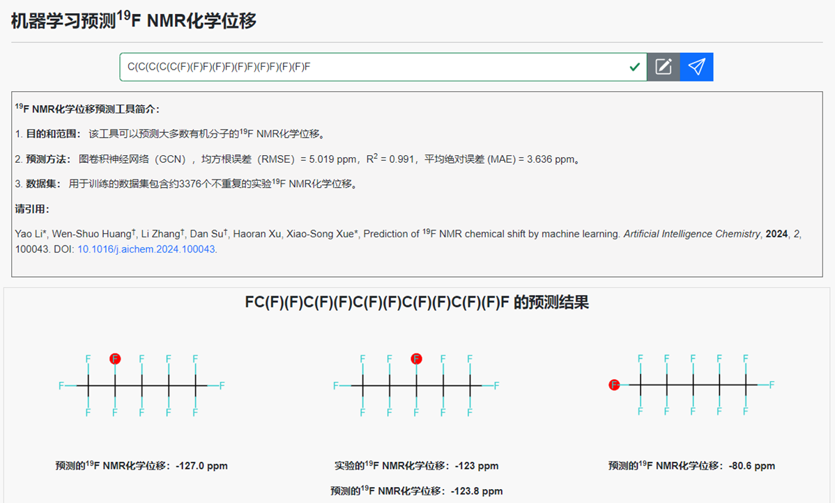 FluoBase不仅包含丰富的试剂信息,还纳入了机器学习模型。研究人员收集了3376个不重复的19F NMR化学位移,使用图卷积神经网络实现了19F NMR化学位移的精准预测。通过FluoBase中的FNMR预测页面(https://fluobase.siochemdb.com/fnmr),可以有效地快速在线预测各种有机氟化合物的19F NMR化学位移。