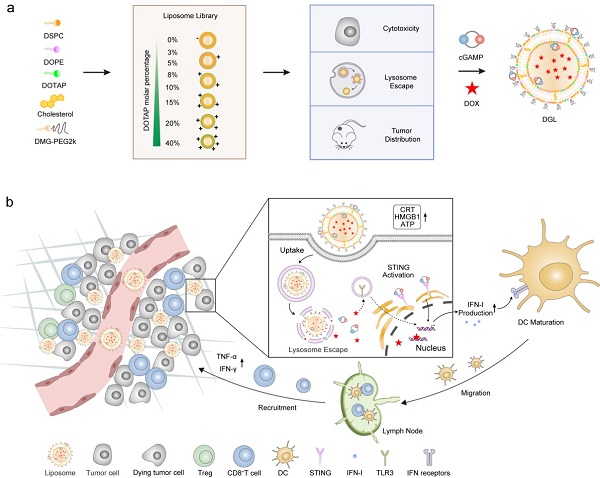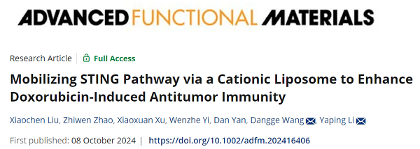 2024年10月8日,中国科学院上海药物研究所李亚平团队与上海交通大学王当歌团队联合在Advanced Functional Materials在线发表了题为Mobilizing STING pathway via a cationic liposome to enhance doxorubicin-induced antitumor immunity的研究论文。研究团队优选出一种阳离子脂质体,共递送STING激动剂cGAMP和阿霉素(DOX),通过激活STING通路增强DOX诱导的抗肿瘤免疫应答,改善癌症免疫治疗效果。