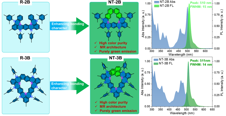 全球数字经济的迅猛发展促使我们着力研发更窄发光波段的OLED发光材料,以满足国际电信联盟针对超高清电视推荐标准(BT.2020标准)下的高清显示技术要求。多重共振原理为窄带发光材料的分子设计提供了一种新颖的方法。近年来,研究人员开发的基于ν-DABNA及其衍生物的R-2B和R-3B展现出极窄的全宽半高值(FWHM)(R-2B:17nm;R-3B:13nm)。然而,它们的发射峰位于天蓝色区域,不符合BT.2020基色标准。尽管如此,该特殊分子框架仍表现出显著的化学修饰潜力。