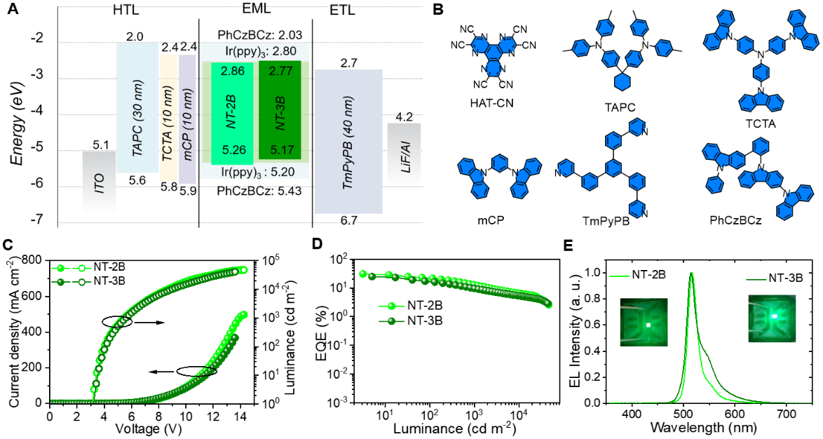 基于此,中国科学院宁波材料技术与工程研究所葛子义研究员、李伟副研究员及其合作者通过将R-2B和R-3B中的苯环替换为萘单元,显著增强了新制备材料NT-2B和NT-3B的成键特性,使得光谱明显向绿光区域移动,同时未增加材料的FWHM(NT-2B:15nm;NT-3B:14nm)。此外,NT-2B和NT-3B展现出较快的辐射衰减速率以及较高的发光量子产率。以磷光材料Ir(ppy)3作为敏化主体、以NT-2B作为客体构建的OLED,其电致发光光谱红移至516~517 nm,最高效率达到30.6%,CIEy值和FWHM分别为0.74和21.5 nm,接近BT.2020标准下绿光的CIEy值,是目前报道中窄带发光绿光OLED最高效率之一。