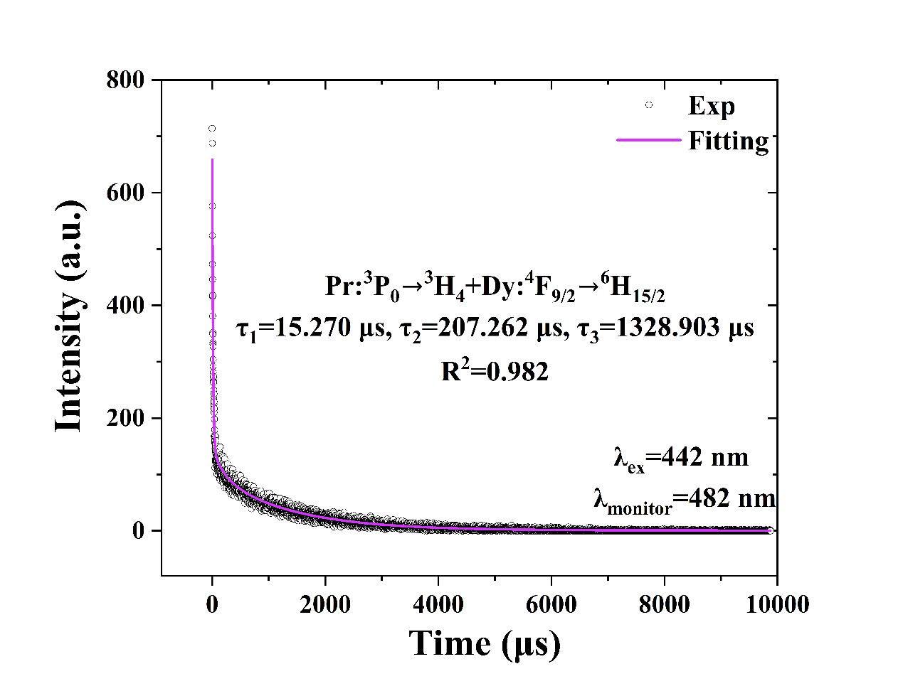 图1. 通过442 nm激发,在482 nm处监测的Dy3+,Pr3+:CeF3晶体荧光衰减曲线