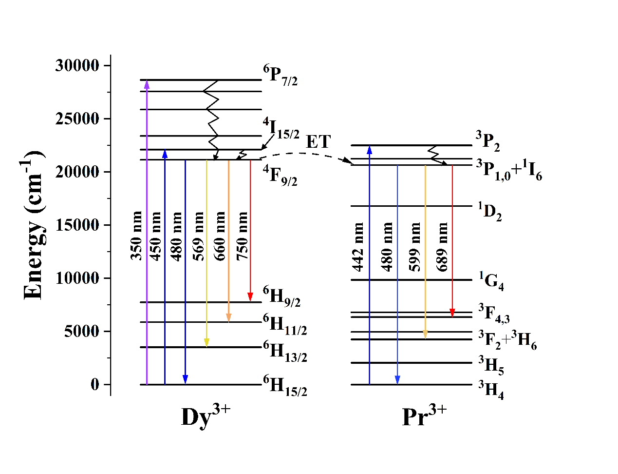图2. Dy3+-Pr3+间能量转移过程示意图