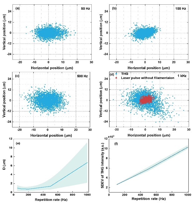 图1. 不同重复频率下三次谐波(TH)光束指向分布云图。(a)50Hz, (b)100Hz, (c)500Hz, (d)1 kHz。三次谐波光束指向偏差距离(e)及强度抖动(f)随成丝重复频率的变化曲线。红色点表示未成丝时泵浦激光的指向分布。