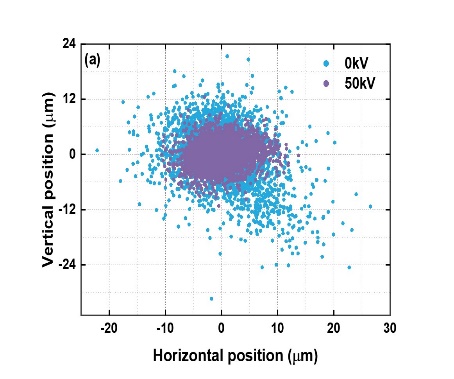 在该工作中,团队研究了飞秒激光空气成丝诱导三次谐波的稳定性问题,发现高重复频率条件下,激光成丝产生的三次谐波光束抖动显著增强(图1),严重影响了三次谐波的稳定性,成为制约其应用的技术瓶颈。为了解决这一难题,研究团队创新性地引入了外部直流电场,成功抑制了三次谐波光束的指向和强度抖动。实验结果显示,在1 kHz重复频率下,光束指向抖动降低了约50%,强度抖动也得到有效抑制(图2)。这是由于外部电场能够抑制等离子体复合效应,减少脉冲之间因等离子体复合造成的热量沉积,从而降低了由热扩散造成的气流扰度强度。流体动力学数值模拟结果进一步证实了外加直流电场对激光丝等离子体通道稳定性的提升,进而提高了三次谐波的稳定性。该研究不仅为开发高重复频率、高稳定性的大能量紫外和极紫外激光源奠定了基础,也为其在成像、精密加工等领域应用开辟了新的机遇。