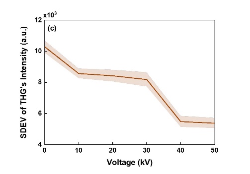 图2 (a)未施加和施加电场后基于1kHz光丝产生的TH光束指向分布云图。(b)1kHz TH光束指向偏差距离与施加在光丝上电压的关系。(c)1kHz TH的强度抖动与施加在光丝上电压的关系。