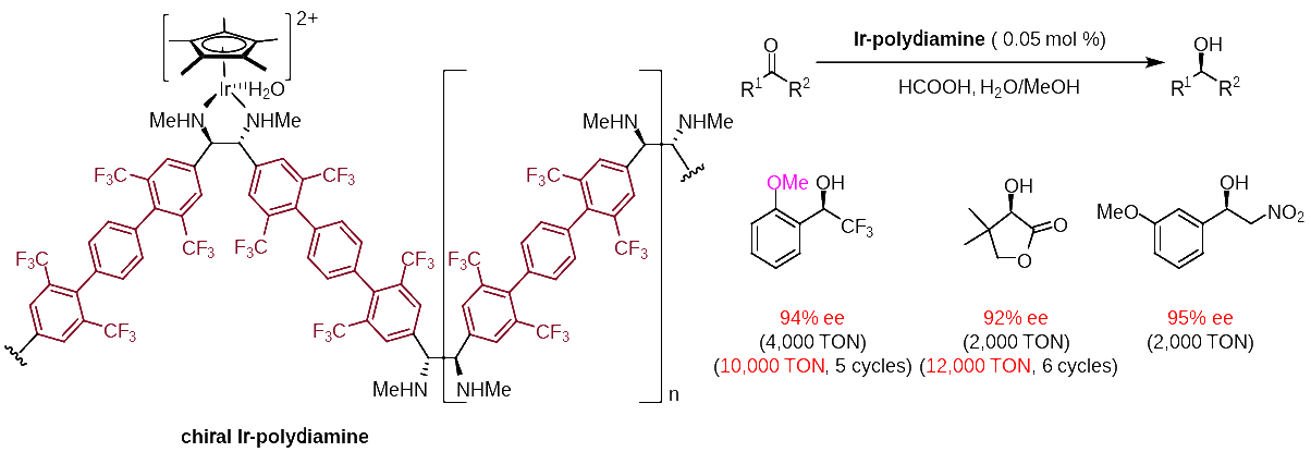 近日,中国科学院上海有机化学研究所汤文军课题组基于前期在双硼介导[3,3]-σ重排方面的研究工作(J. Am. Chem. Soc.2017,139,9767;J. Am. Chem. Soc.2020,142,10337;Angew. Chem.,Int. Ed. 2023,62,e202300334),着眼发展可工业化、具有高转化数的不对称催化反应,通过双硼介导的不对称还原偶联得到了一系列新型的手性聚合二胺配体,并制备成相应的铱催化剂。该类高效、可循环使用的铱催化剂在众多官能团化酮的不对称转移氢化中表现出优秀的对映选择性(最高可达99% ee)和前所未有的总转化数(12,000转化数,6次循环),展示出良好的工业应用前景。