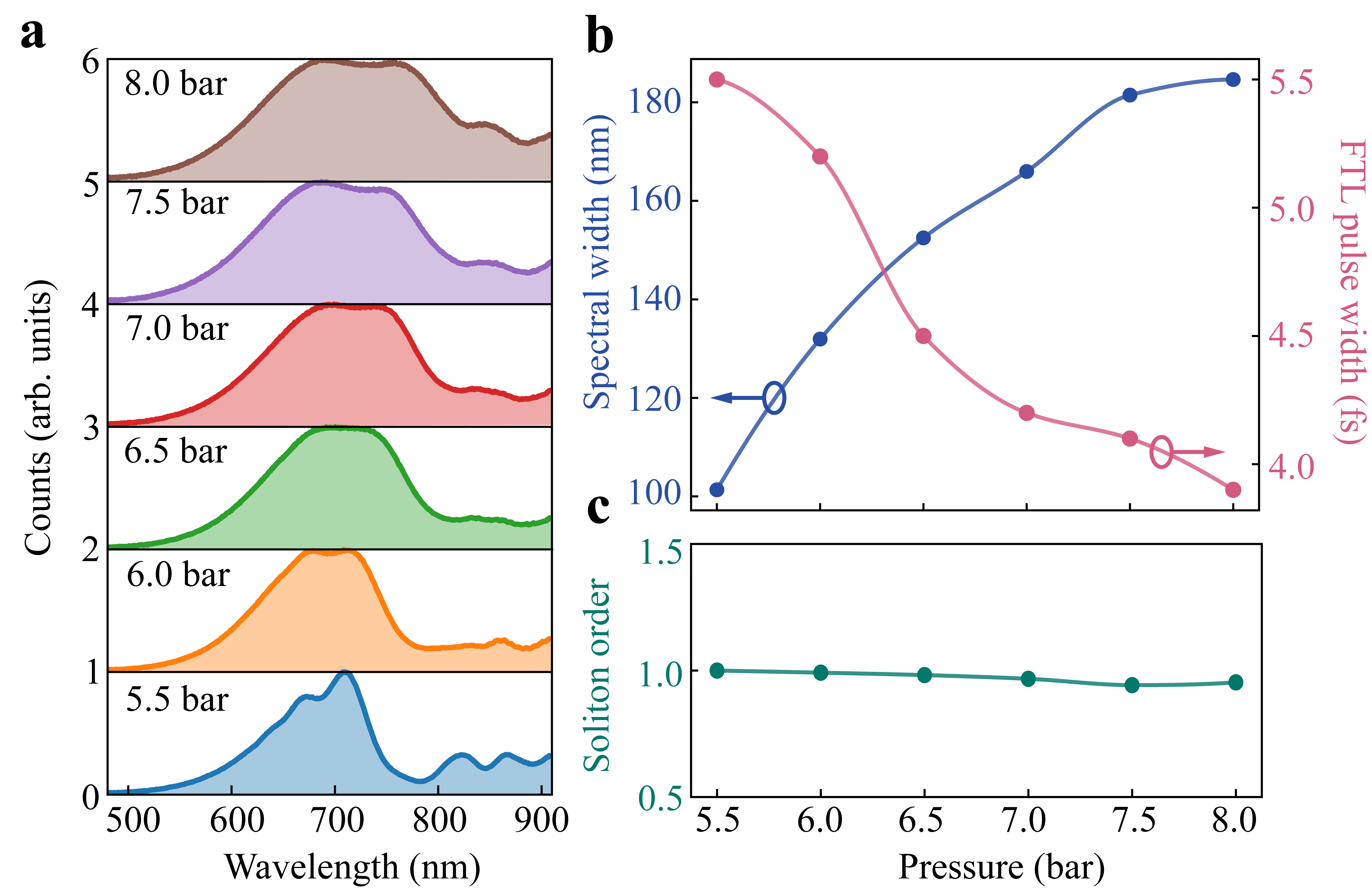 在本项研究中,研究团队系统研究了蓝移孤子的谱宽调控机理,通过理论和实验相结合,揭示了这种谱宽调谐规律遵循孤子面积理论。在实验中,通过改变空芯反谐振光纤中的气压和入射脉冲能量,在光纤输出端获得了高重复频率(10 kHz)可调谐超快脉冲,中心波长调谐范围为900 nm至650 nm,带宽调谐范围为100 nm至180 nm(700 nm波长处),对应7.2 fs至5.4 fs的可调谐脉冲宽度,实验的结果与理论预测相吻合。这种可调谐超快光源有望应用于超快光谱学和非线性光学等研究领域。