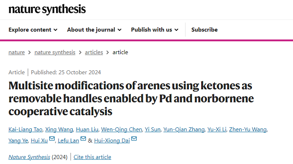 2024年10月25日,中国科学院上海药物研究所戴辉雄课题组与国科大杭州高等研究院蓝乐夫课题组合作在国际知名期刊Nature Synthesis发表了题为 “Multi-site modifications of arenes using ketones as removable handles enabled by Pd and norbornene cooperative catalysis”的研究论文。该论文通过钯/降冰片烯催化下芳酮官能团接力Catellani反应,实现了对芳烃的多位点修饰,并进一步应用于脱氢松香酸分子库的构建。