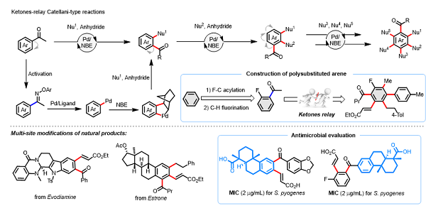 天然产物具有独特且多样的分子结构,是药物研发的重要来源。据统计,有超过50%的小分子药物直接或间接地来源于天然产物。然而由于天然产物结构复杂、来源局限,限制了其在药物研发中的广泛应用。因此,发展有效的天然产物结构修饰的方法与策略以提高生物活性、改善药物代谢性质、减轻毒性,成为药物研发的研究热点。目前,化学家主要过官能团转化、碳-氢键活化等策略以实现对天然产物单一位点的修饰。碳-碳键是有机分子最为核心的化学键。发展碳-碳键断裂与重组的新方法为药物分子及天然产物的合成、改造提供便捷路径。芳酮是一类重要的有机化合物,其广泛存在于药物分子,功能材料和天然产物中。同时酮的合成已非常成熟,可以通过羧酸的Weinreb酮合成法、Friedel-Crafts酰基化等引入。近年来,戴辉雄课题组发展了配体促进的非张力芳酮碳-碳键活化策略,通过与不同的亲核试剂反应,实现了芳酮的硼化、芳基化、炔基化、烯基化、烷基化及硅化等多种官能团转化(Angew. Chem. Int. Ed. 2024, 65, e202319773; Angew. Chem., Int. Ed. 2020, 59, 14388; ACS Catal. 2021, 11, 1758; ACS Catal. 2022, 12, 82; Sci. China Chem. 2023, 66, 2037; Org. Lett. 2021, 23, 2147; Chem. Commun., 2021, 57, 9716; Org. Lett. 2021, 23, 8291; Org. Lett. 2022, 24, 7344; Chem. Commun. 2023, 59, 3269; J. Org. Chem. 2022, 87, 6807; iScience 2022, 25, 104505; Chin. J. Chem. 2023, 41, 3587; Tetrahedron Lett. 2022, 95, 153721)。在该项研究中,研究人员发展了基于芳酮碳-碳键活化的Catellani反应,通过钯/降冰片烯催化下芳酮官能团的连续接力,实现对天然产物多位点修饰。作者以廉价易得的苯为起始原料,通过傅克酰基化、酮导向的邻位碳氢键氟化以及芳酮接力Catellani反应,构建了高附加值的1,2,3,4-, 1,2,3,4,5- 以及1,2,3,4,5,6-多取代芳烃骨架。研究人员还通过该策略,快速构建了基于天然产物脱氢松香酸的分子库,并通过对耐甲氧西林金黄色葡萄球菌(MRSA)USA300 LAC 和化脓性链球菌 ATCC 12344的抗菌活性筛选,得到高活性的苗头化合物。