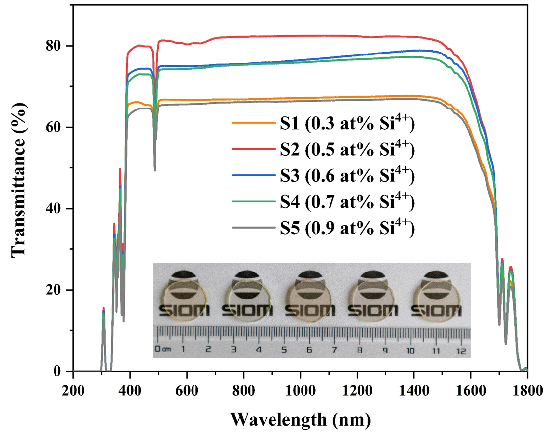 研究团队开发了一种镁硅共掺杂铽铝石榴石磁光陶瓷制备方法,该陶瓷获得了目前采用一步真空固相反应烧结方法制备TAG陶瓷的最高透过率和最低光学损耗。研究参考过去按照MgO+TEOS重量比添加的TAG陶瓷样品的最佳组成比,并将其设计到晶格中,以探索制备具有较低残留散射的TAG陶瓷。使用Mg2+和Si4+离子作为TAG晶格的组分,用于非化学计量比共掺杂,在不降低MgO和TEOS的绝对量的情况下,陶瓷在1064 nm处的透过率为82.48 %,光学损耗为0.048 cm-1,并系统地分析了硅掺杂量对TAG陶瓷微观结构和光学性能的影响。非化学计量的晶格掺杂代替传统的烧结助剂重量比添加,为制备高功率激光系统中其他受残留烧结添加剂影响的高质量陶瓷提供了有效的解决思路。