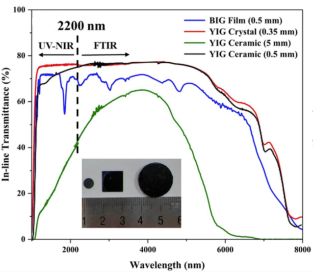 图4:YIG陶瓷、YIG单晶及BIG厚膜的透过率