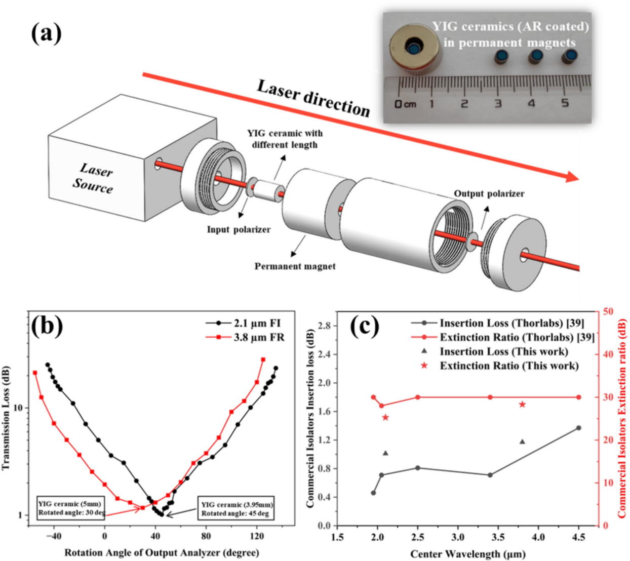 图5 (a) 基于YIG陶瓷的中红外FI示意图。(b) 基于YIG陶瓷的2.1 µm FI和3.8 µm FR的性能。(c) 本工作中开发的器件与商用隔离器之间的插入损耗和消光比的比较。