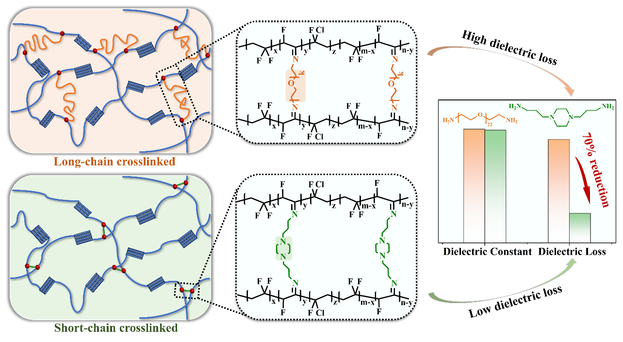 高介电常数弹性体具有柔软、可拉伸、响应快和可靠性高等特点,是一种用途广泛的材料,可应用于人工肌肉、驱动、传感、信息处理和能量存储等领域。弹性体既能适应生物组织的应变,又能在人体运动过程中保持电气稳定性,因此特别适用于可穿戴电子设备。前期,中国科学院宁波材料技术与工程研究所前沿交叉科学研究中心弹性铁电材料与器件课题组报道了在 1 kHz 时介电常数高达 35.4(100 Hz 时介电常数高达 54.2)的本征弹性体( Advanced Materials, 2024, 36, 2404001),这种弹性体通过利用 “微交联 ”法对与软长链交联的弛豫铁电聚合物进行弹性化,以平衡材料的铁电性和弹性。然而,软长链交联的本征弹性体材料在交变电场下的介电弛豫和高流动性会导致大量能量耗散,从而导致大量介电损耗。从实际应用的角度来说,如在介电驱动器和电容式传感器中,在强场驱动条件下,高介电损耗会导致机电设备产生大量热量,降低设备灵敏度甚至导致设备失效,除此以外,高介电损耗还会出现泄漏电流增大和击穿强度降低等问题,对设备造成不利的影响。因此,找到一种简单有效的策略来降低高介电常数弹性体的介电损耗,对于提高设备寿命、保持高性能、确保可穿戴电子设备的稳定运行至关重要。