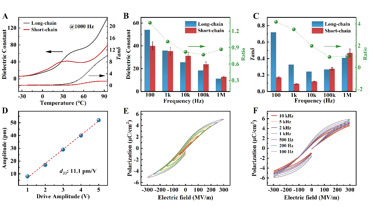 为了解决上述问题,宁波材料所前沿交叉科学研究中心胡本林研究员带领弹性铁电材料与器件课题组通过采用刚性短链交联剂与弛豫型铁电材料 P(VDF-TrFE-CFE) 进行交联,利用弛豫型铁电材料的弹性化成功设计了一种具有高介电常数低介电损耗的本征弹性体材料。交联P(VDF-TrFE-CFE) 的循环应力-应变曲线下面积变得更小,在60%应变下弹性回复率超过70%。该弹性体材料在室温下(25℃)在1 kHz时具备~35的高介电常数,介电损耗小于0.1。与长链交联剂相比,将材料的介电损耗降低了70%。除此之外,该弹性体材料具备良好的铁电性、压电性和热稳定性,制备的弹性器件在80%的应变下仍具备稳定的铁电响应。